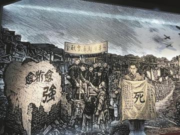 观众驻足观展。四川日报全媒体记者李志强摄冯玉祥的隶书字条“还我河山”。四川日报全媒体记者 简霞 摄“四川人民一致抗日”瓷坛。朱德及何文元家书。以“死”字旗为背景创作的版画作品。本文图片除署名外均由四川日报全媒体记者 吴晓铃 摄