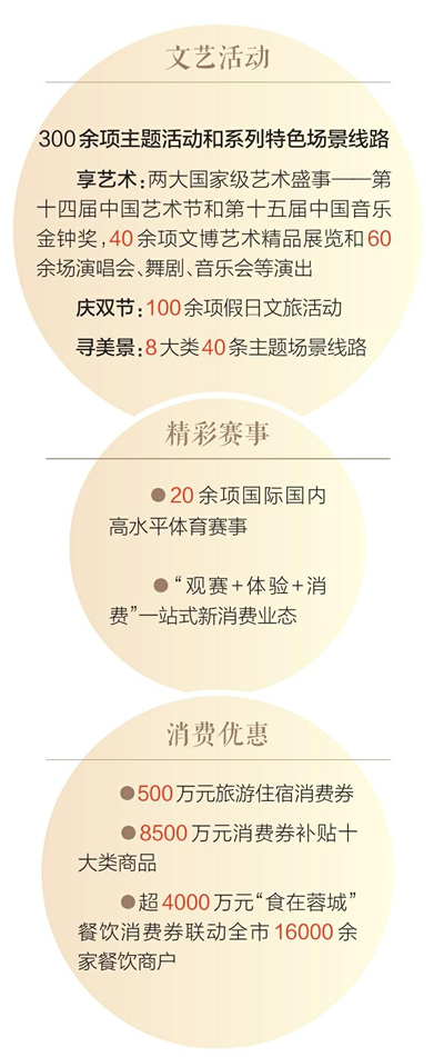 成都市文广旅局副局长魏湘军介绍,成都将突出享艺术、庆双节、寻美景的特色亮点,筹划推出300余项主题活动和系列特色场景线路。