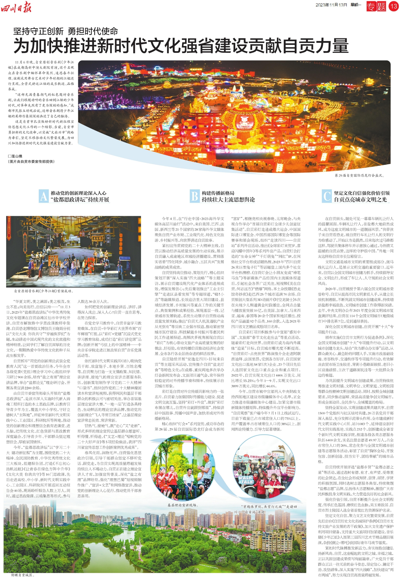 这是自贡市扎实做好新时代新征程宣传思想文化工作的一个缩影。当前,自贡市勇担新的文化使命,以实施“文旅兴市”战略为牵引,坚定不移推动文化繁荣发展,为四川加快推进新时代文化强省建设贡献力量。