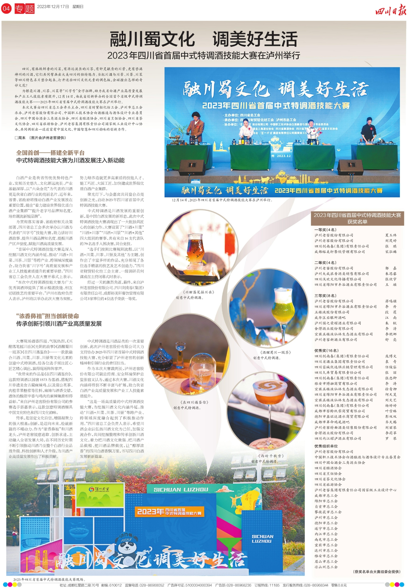 为擦亮川酒、川茶、川菜等“川字号”金字招牌,助力我省白酒产业高质量发展和产业工人技能素质提升,12月14日,由我省创新举办的全国首个省级中式特调酒技能大赛——2023年四川省首届中式特调酒技能大赛在泸州举行。