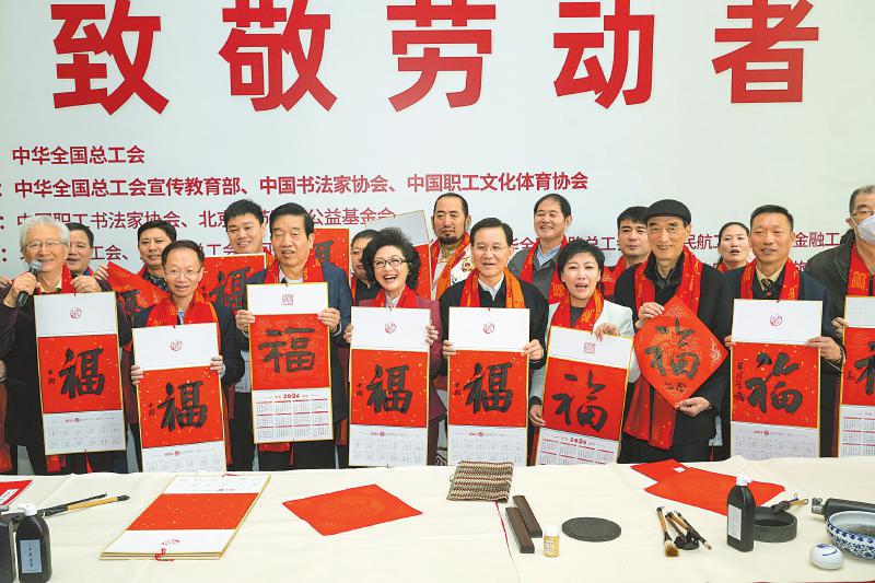1月16日,在北京的中国职工之家举行的万福迎春——2024年“送万福、进万家”书法公益活动上,劳模与职工代表们展示书法家们写的福字。 新华社记者 才扬 摄
