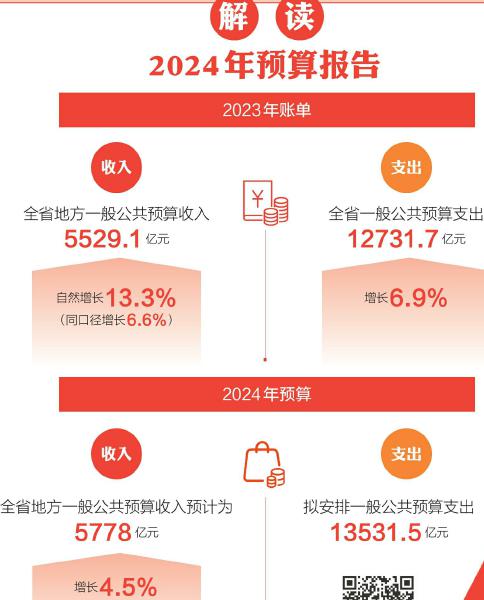 《预算报告》显示,2023年全省地方一般公共预算收入5529.1亿元,自然增长13.3%(同口径增长6.6%);一般公共预算支出12731.7亿元,增长6.9%。收入和支出规模分别站上5000亿元和1.2万亿元的新台阶。