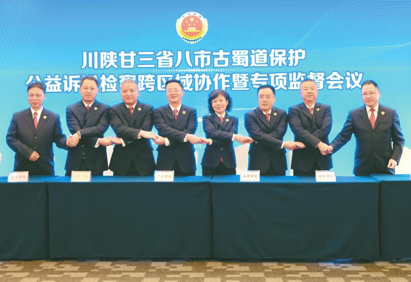 2023年11月,广元市检察院牵头,四川成都、德阳、绵阳、南充、巴中和陕西汉中、甘肃陇南等地的检察院齐聚一堂,召开川陕甘三省八市古蜀道保护公益诉讼检察跨区域协作暨专项监督会议,签署《古蜀道保护公益诉讼检察跨区域协作机制》,构建了从线索移送反馈、调查取证协查、联席会议沟通,到专项监督联动等方面协作的古蜀道公益检察保护大格局,部署以年为周期,八市轮值开展古蜀道保护系列专项监督活动,唱响了覆盖地域更广、保护领域更多、协作范围更大的跨区域保护“协奏曲”。