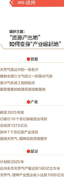 天然气是达州的一张名片,普光气田是全国三大气田之一,这里也是川气东送工程的起点,是国家重要的能源资源战略基地。如今,达州正围绕天然气等资源做文章,招引大项目、延长产业链,打造万达开天然气锂钾综合利用集聚区。计划到2025年,达州全市天然气产量达到160亿立方米,天然气、锂钾产业营业收入达到1000亿元。