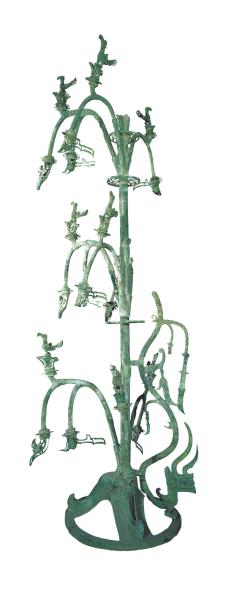 三星堆博物馆,青铜神树高大华美。如果仔细观察,就会发现有一条长龙从神树上方蜿蜒而下。三星堆博物馆景区管委会遗址管理部部长朱亚蓉介绍,在古代典籍中,神树往往成为日月出没的场所和沟通天地的象征,东方的扶桑、中央的建木和西方的若木,便是古代传说中三棵这样的神树。那么,人界的王或者巫师靠什么往来于天地之间呢?那就是这条呈游动状的龙。三星堆的工匠们将游龙呈现于神树之上,艺术化地表达了神树沟通天地的意象。