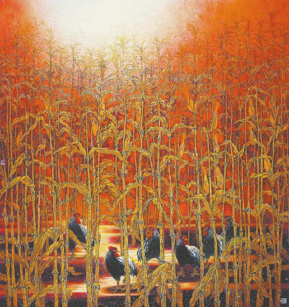 《包谷林》是四川省美术家协会主席梁时民的成名作,完成于2002年。他曾表示,“在改革开放的时代背景下,如何用花鸟画的形式呈现祖国的繁荣昌盛成了创作的立足点,最终我选择了一片玉米地作为画面背景,就是后来大家熟知的《包谷林》。”为了让画面更富生机,艺术家用几只雄鸡穿插其间,同时在背景中加上了一条白色的、弯弯曲曲的小溪,增强画面纵深感,让包谷林看起来更加深邃。红色、黄色、黑色等丰满的色彩搭配,点、线、面巧妙的组合,使画面充满和谐之音。玉米地上方的一束阳光,照耀着祖国的大地,表现出一片欣欣向荣、繁荣昌盛的气息。(余如波)