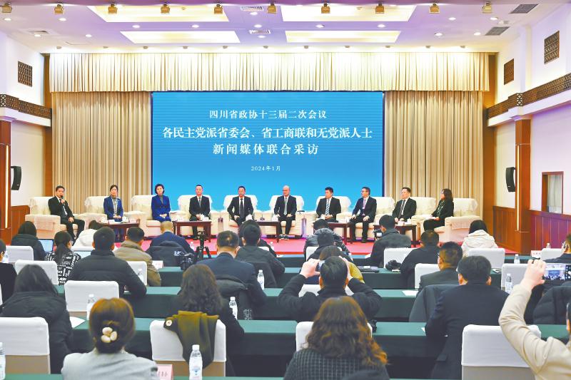 1月23日晚,成都金牛宾馆中苑会议室内,各民主党派省委会、省工商联有关负责人和无党派人士代表,围绕本次省两会的重点提案、年度履职情况以及特色亮点工作等内容,接受新闻媒体联合采访。