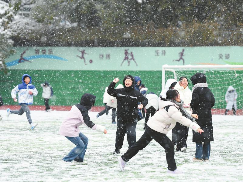1月24日,绵阳各地下起久违的大雪。图为绵阳南山中学的同学们在操场与冰雪“互动”。绵阳南山中学供图