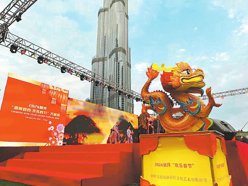 在龙年春节即将到来之际,中国驻阿联酋大使馆、中国驻迪拜总领馆、文化和旅游部共同举办的2024迪拜“温暖迎春欢乐春节”大巡游活动日前在哈利法塔下的公园举行。