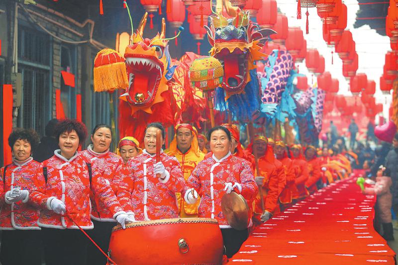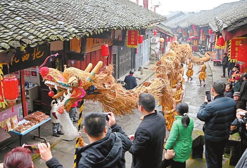 2月1日,文化志愿者在南充市蓬安县周子古镇表演舞草龙。
