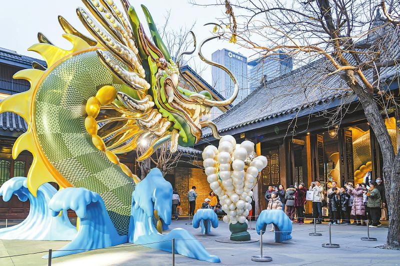 2月6日,游客在成都市太古里鲤跃龙腾公共装置艺术品前打卡。