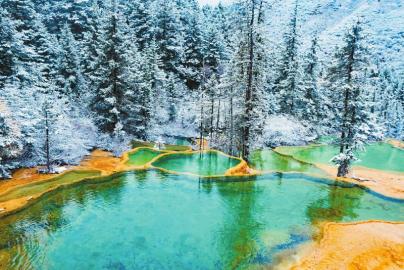 冬日的九寨蓝冰,堪称一绝。巨大的天然冰瀑晶莹剔透、奇妙多姿,阳光照射下呈现出深浅不一的独特蓝色,仿佛步入令人沉醉的“童话世界”。在黄龙景区,白雪银装与五彩池相映成趣,营造出浪漫的梦幻之境。