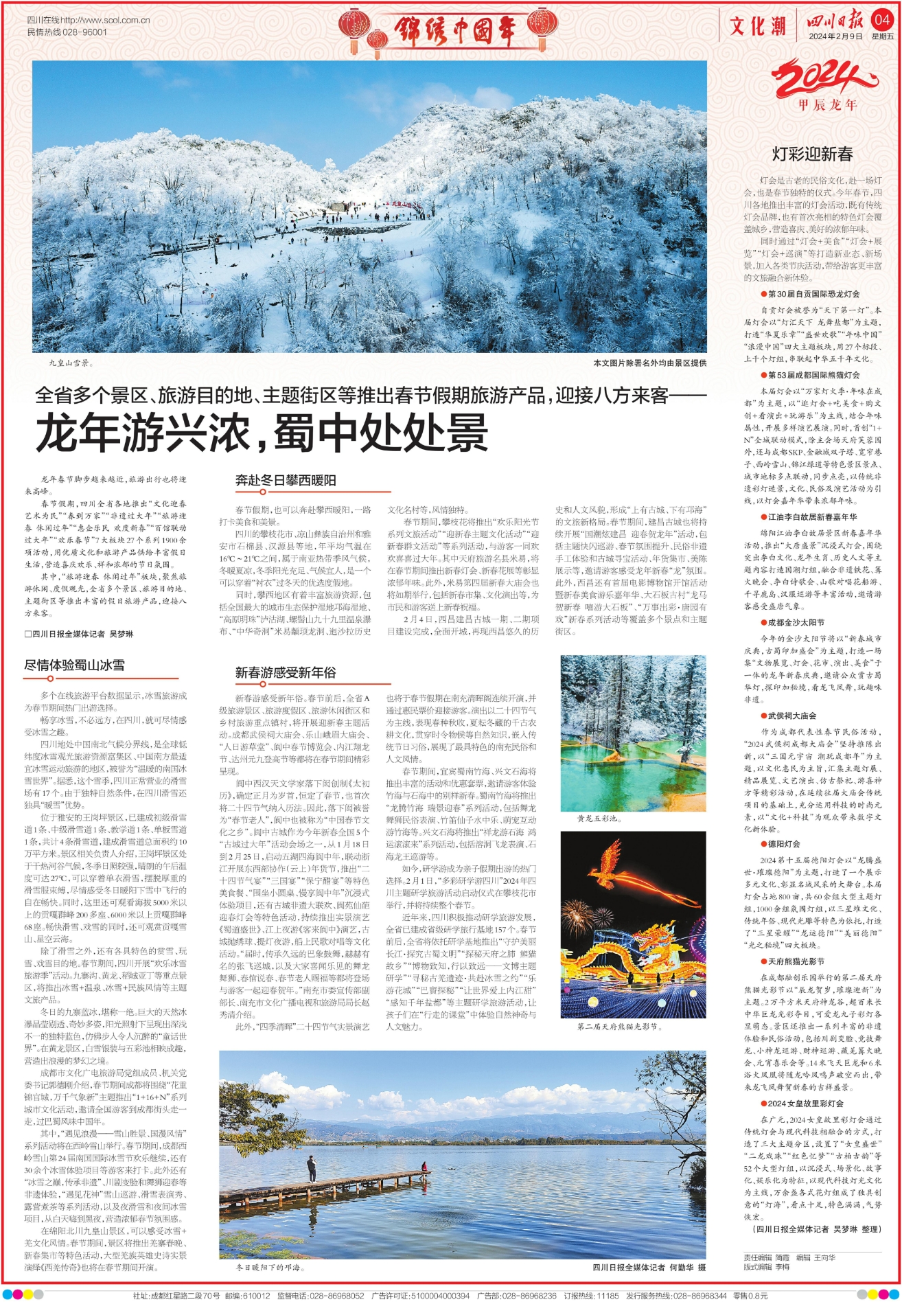 在成都融创乐园举行的第二届天府熊猫光影节以“辰龙贺岁,璀璨迎新”为主题。2万平方米天府神龙谷,超百米长中华巨龙光彩夺目,可爱龙九子彩灯各显萌态。景区还推出一系列丰富的非遗体验和民俗活动,包括川剧变脸、竞技舞龙、小神龙巡游、财神巡游、藏羌篝火晚会、元宵喜乐会等。14米飞天巨龙和6米浴火凤凰将随龙吟凤鸣声破空而出,带来龙飞凤舞贺新春的吉祥盛景。