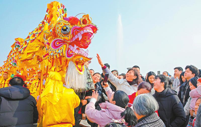2月10日,民间艺人在广安市广安区街头表演舞龙,给群众拜年送祝福。 张晓 摄(C视觉)