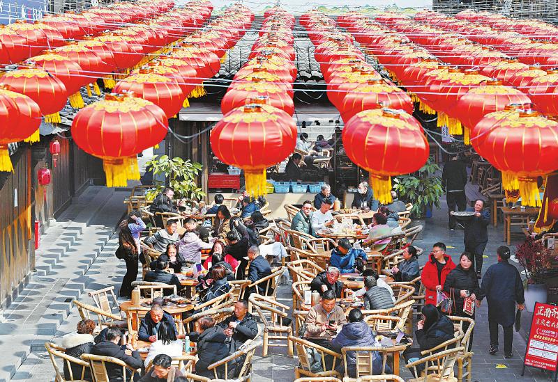 •   2月10日,正月初一,成都东门市井年味十足,四处洋溢着新春的喜庆氛围。游客在此逛集市、品地道坝坝茶、尝鲜各类小吃……在红火热闹的氛围里享受成都特有的安逸与舒适。 四川日报全媒体记者 肖雨杨 摄