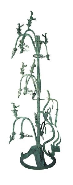 青铜神树三星堆博物馆馆藏文物 三星堆博物馆“镇馆之宝”之一的青铜神树上“挂”着一条神龙。其沿着青铜神树的主干逶迤而下,前足“踏”于整个青铜神树底座上,凸显出“从天而降”的姿态,整体飘逸灵动。专家认为,古蜀先民视这条游龙为沟通天地的使者。