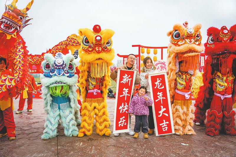 春节期间,成都科幻馆旁,人们在精彩的舞狮表演中庆祝甲辰龙年的到来。