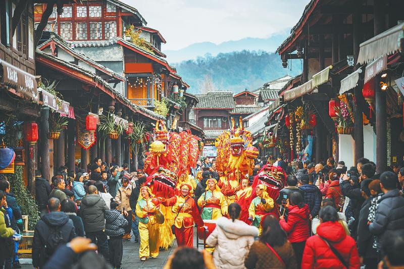 2月14日,成都街子古镇热闹非凡,舞龙舞狮队伍沿街表演,喜庆气氛充满了古镇的每个角落。