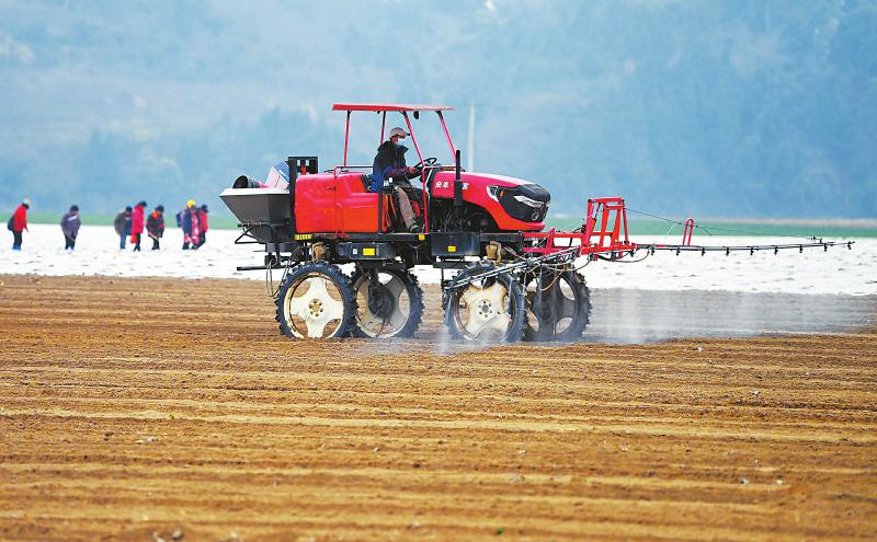 2月14日,南充市蓬安县锦屏镇中坝社区蔬菜种植基地,村民驾驶机器在地里劳作,抢抓农时忙种植。