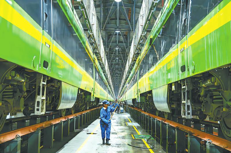 2月17日,攀枝花南站客车技术整备所的工作人员正在清洁“绿巨人”动车组,为春运提供优质服务和保障。