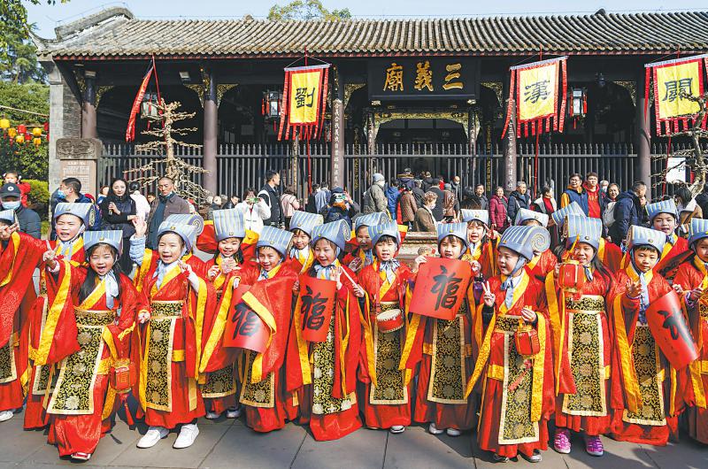 春节期间,龙年专属“小喜神”们在武侯祠大庙会巡游送福,派发喜神红包、福牌、福贴等新年小礼物。