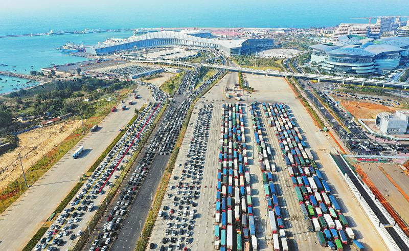 2月17日,大批车辆在海口市新海港等待登船(无人机照片)。当日是春节假期最后一天,琼州海峡迎来返程高峰,海口市各港口待渡场处于饱和状态,大批车辆和旅客在港口附近等待过海。海口市各部门与港口展开联动,组织人员维持排队秩序,为车主旅客提供应急药品、饮用水等物品,保障旅客有序过海。 新华社记者 郭程 摄