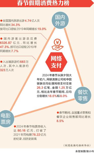 多地景区门票售罄,庙会大集人潮涌动,热门餐厅排起长龙,电影票房刷新纪录……刚刚结束的春节长假,国内旅游出游4.74亿人次,总花费6326.87亿元,春节档票房突破80亿元,日均网络支付交易1.25万亿元。鲜活滚烫的数字背后,是热闹红火的消费场景,是“欢欢喜喜过大年”的幸福图景,也折射出中国经济的活力。