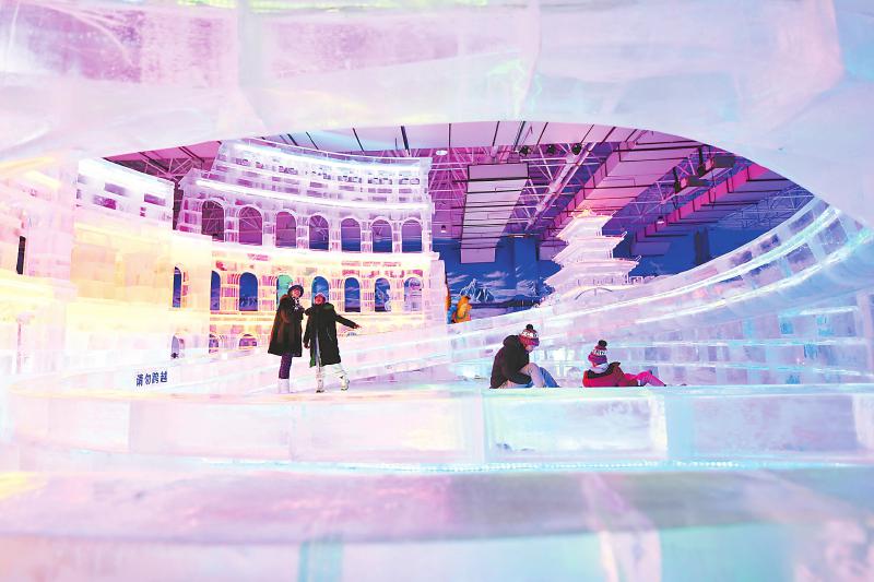 近日,位于“冰城”黑龙江省哈尔滨市的太阳岛冰雪艺术馆开馆迎客。图为2月23日,游客在太阳岛冰雪艺术馆体验冰雪娱乐项目。 新华社记者 王建威 摄