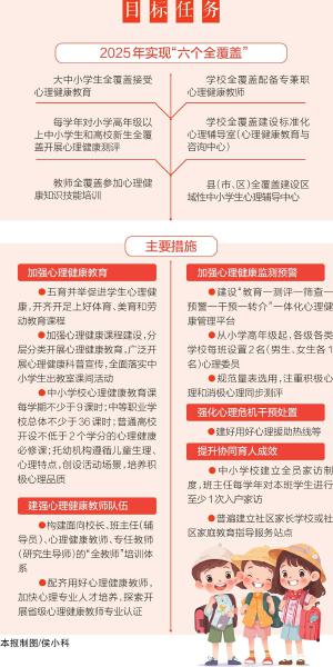 主要措施实。从加强心理健康教育、建强心理健康教师队伍、加强心理健康预警防控、强化心理危机干预处置、提升协同育人成效5个方面,细化提出17条具体要求,对学生心理健康工作薄弱环节提出明确要求。