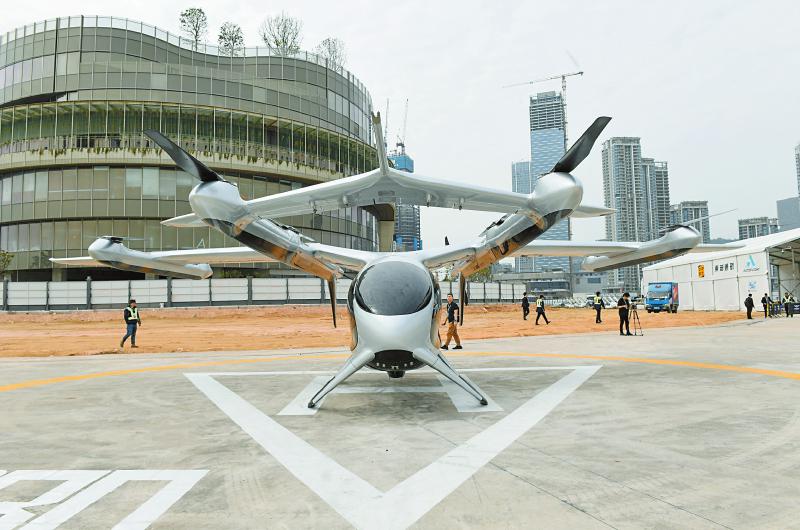 2月27日在深圳蛇口邮轮母港拍摄的5座eVTOL(电动垂直起降)航空器盛世龙。 新华社记者 毛思倩 摄