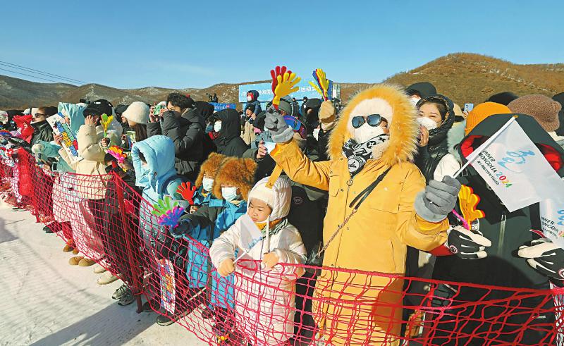 2月23日,观众在呼伦贝尔市扎兰屯金龙山滑雪场为参赛运动员加油助威。