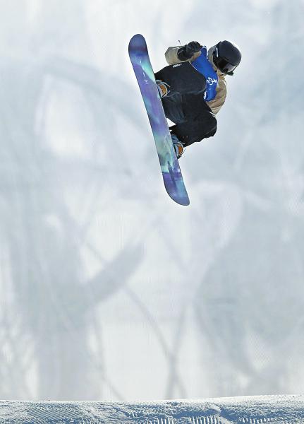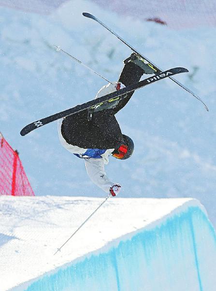 2月21日,参赛运动员在U型场地技巧比赛中跳跃、回转。