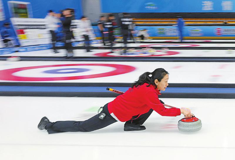 2月19日,四川队选手周妍在冰壶比赛中。