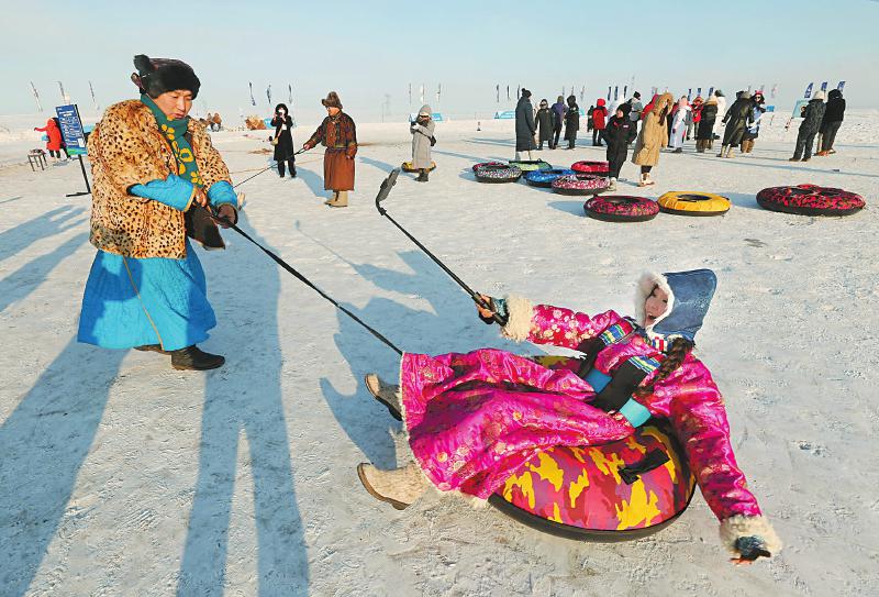 赛场上比赛激战正酣,赛场外,人们充分感受冰雪运动的激情。2月19日,游客在呼伦贝尔零下19摄氏度的户外体验转雪圈。