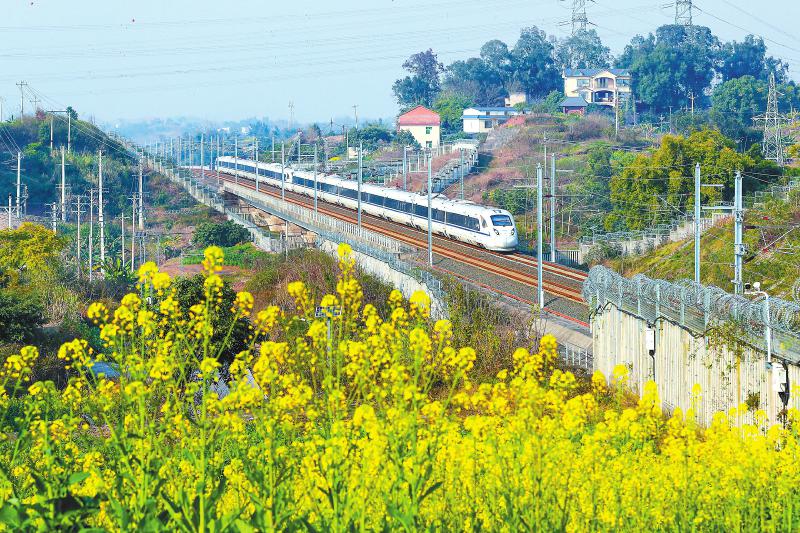 春意渐浓,近日,泸州市龙马潭区胡市镇境内,绵泸高铁内自泸段,一列动车驶过油菜花田。 牟科 摄(C视觉)