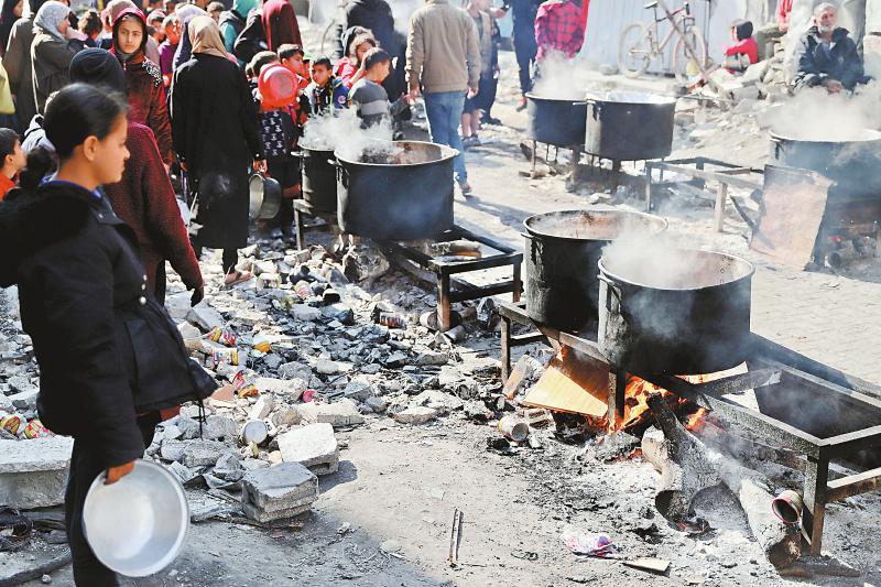2月27日,在加沙地带北部的杰巴利耶难民营,人们等待领取食物。联合国机构官员27日警告,巴勒斯坦加沙地带目前至少四分之一人口濒临饥荒,若不及时采取相应行动,大范围饥荒“几乎不可避免”。 新华社发(穆罕默德·阿里 摄)