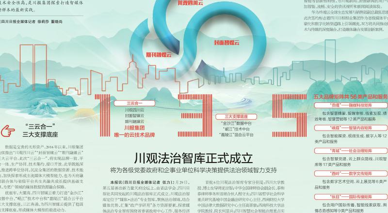 四川智媒云是川报集团技术新品牌,也是唯一的云技术品牌。这朵“135”体系的智媒云,整合了川报集团优势技术资源、数据资源、算法资源,实现“川观四川云”“封面智媒云”“期刊融媒云”三云合一,建设数据中台、技术中台和混合云平台三大支撑底座,包含五大品牌矩阵,技术竞争力强、技术赋能优、技术安全性高,是川报集团探索打造智媒体新样本的最新实践。