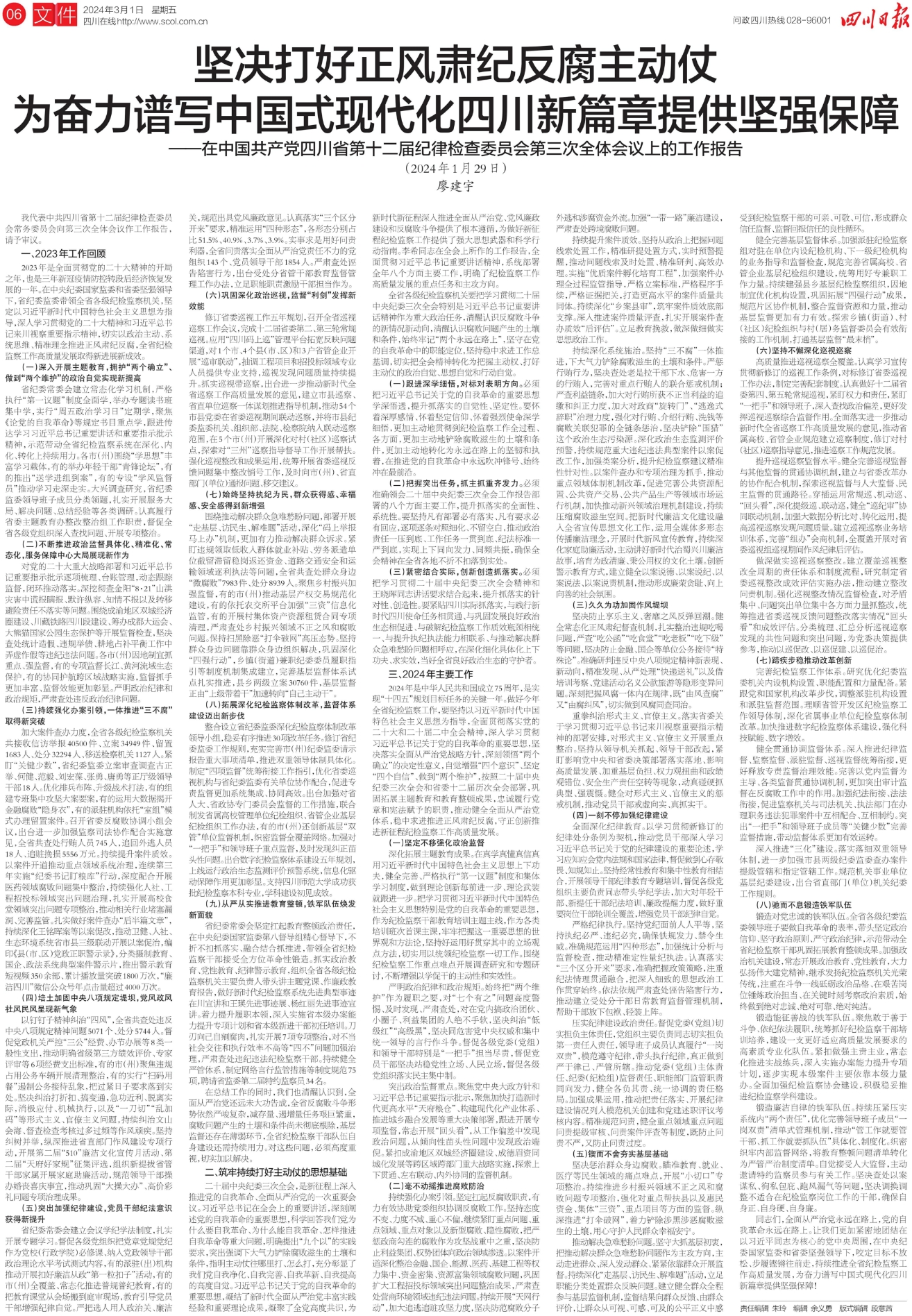 2023年是全面贯彻党的二十大精神的开局之年,也是三年新冠疫情防控转段后经济恢复发展的一年。在中央纪委国家监委和省委坚强领导下,省纪委监委带领全省各级纪检监察机关,坚定以习近平新时代中国特色社会主义思想为指导,深入学习贯彻党的二十大精神和习近平总书记来川视察重要指示精神,切实以政治主动、系统思维、精准理念推进正风肃纪反腐,全省纪检监察工作高质量发展取得新进展新成效。