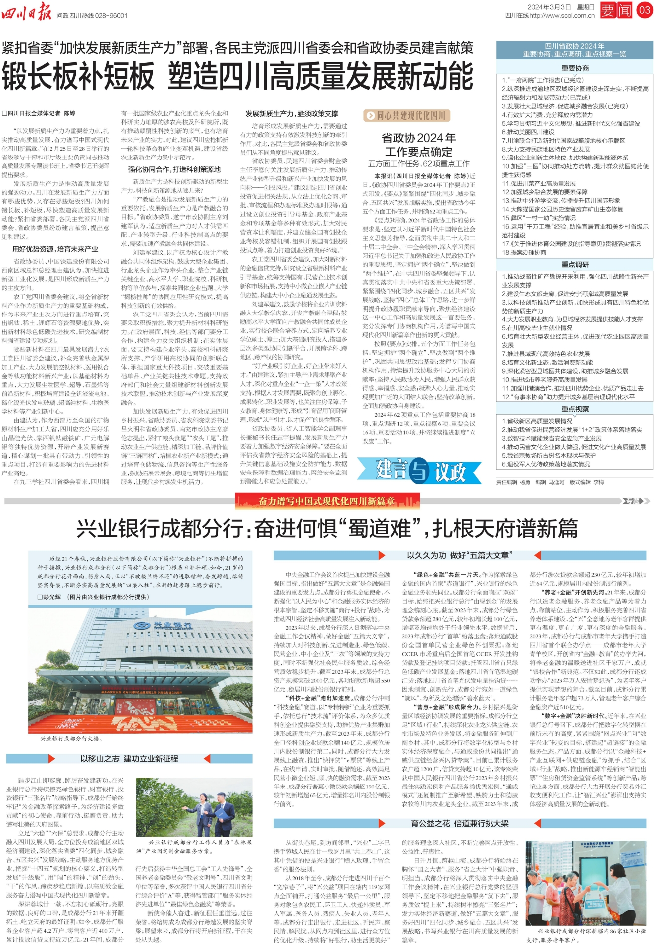 本报讯(四川日报全媒体记者 陈婷)近日,《政协四川省委员会2024年工作要点》正式印发。《要点》紧紧围绕“四化同步、城乡融合、五区共兴”发展战略实施,提出省政协今年五个方面工作任务,并明确62项重点工作。