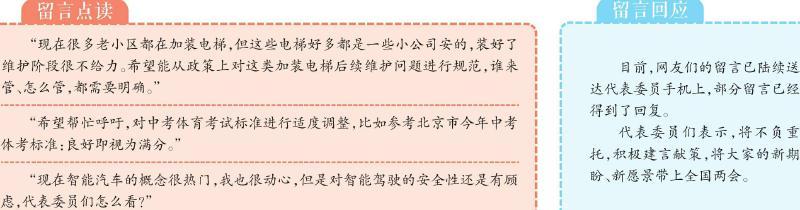 目前,网友留言已陆续送达代表委员手机上,部分留言已经得到了回复。代表委员们表示,将不负重托,积极建言献策,将大家的新期盼、新愿景带上全国两会。