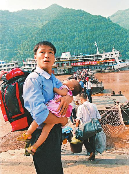 深情回眸 2000年8月13日,一位三峡外迁移民怀抱熟睡中的婴儿,在重庆云阳港上船时,扭头回望家园。