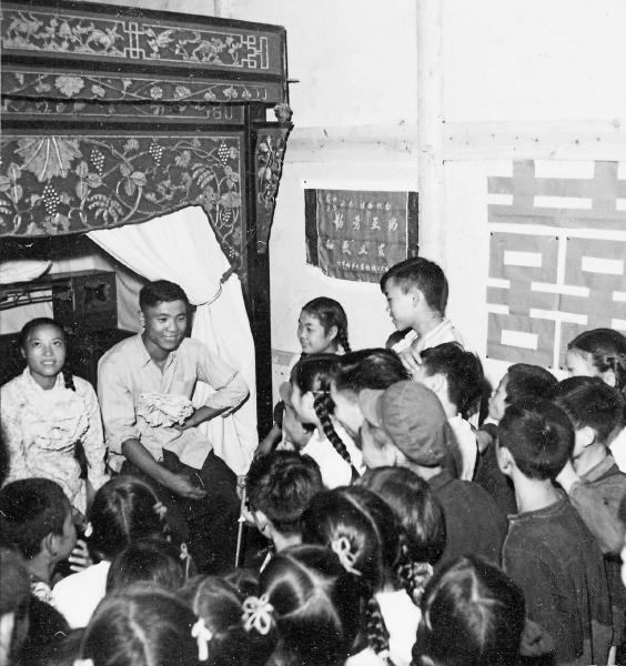 新式婚礼 1956年5月,温江公平乡青年何其田举行简朴的新式婚礼,新郎新娘在新房中接受亲友的祝福。