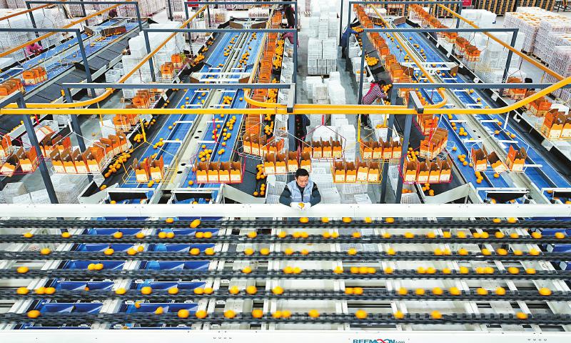 3月2日,在眉山市仁寿县水果智能分拣车间,工作人员正在分选线上工作。 近年来,仁寿县的柑橘、梨子等时令水果实现智能分拣,对果形、果重、果面干净度和含糖量精准分选,助力当地水果产业提质增效。潘建勇 摄(C视觉)