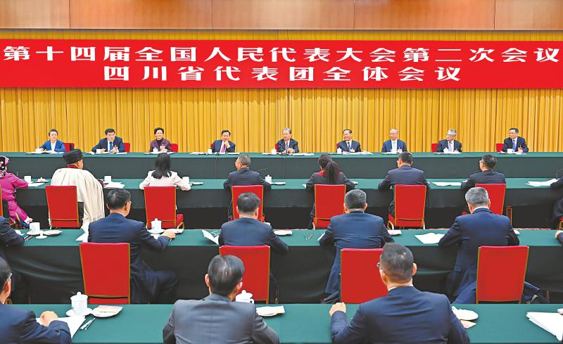 本报综合消息 3月5日下午,出席十四届全国人大二次会议的四川代表团在人民大会堂东大厅举行全体会议,集中审议李强总理所作的政府工作报告。