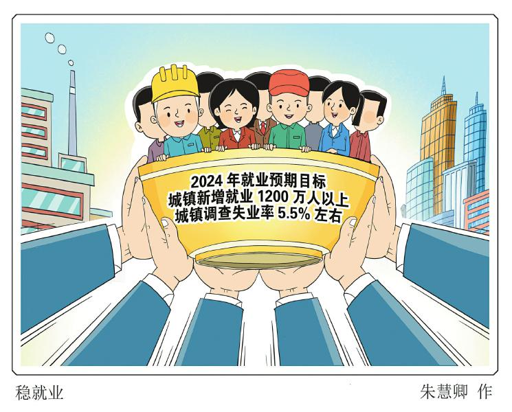 城镇新增就业1200万人以上,城镇调查失业率5.5%左右——3月5日提请审议的政府工作报告提出2024年更加积极的就业目标,传递出更大力度稳就业、强信心的信号,那就是稳住就业大盘。 朱慧卿 图