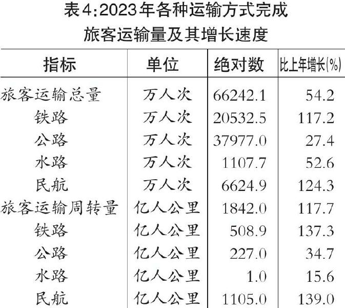 表3:2023年各种运输方式完成货物运输量及其增长速度