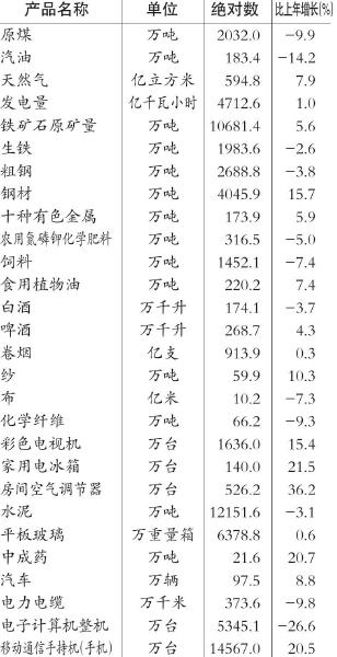 从主要产品产量看,原煤产量比上年下降9.9%,发电量增长1.0%,天然气增长7.9%,单晶硅增长113.2%,钢材增长15.7%,彩色电视机增长15.4%,汽车增长8.8%,啤酒增长4.3%。全年规模以上工业企业产销率为95.2%。