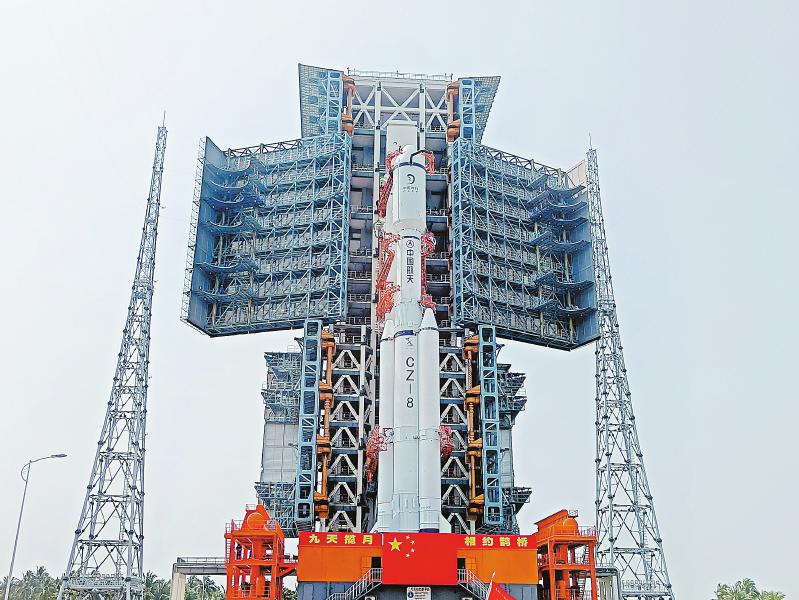 国家航天局消息,3月17日,探月工程四期鹊桥二号中继星和长征八号遥三运载火箭在中国文昌航天发射场完成技术区相关工作,星箭组合体垂直转运至发射区,计划于近日择机实施发射。 新华社发(黄国畅 摄)