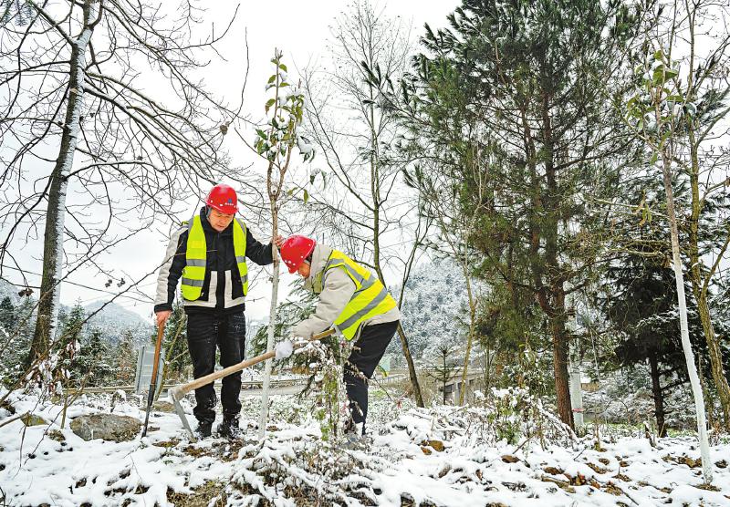 1月23日,护林员在雪后的古蔺县观文镇养护树苗。