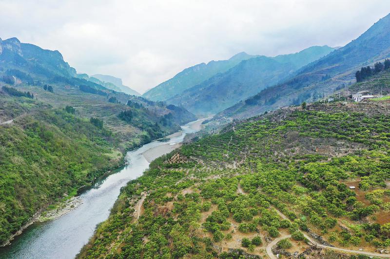 古蔺县椒园镇龙凤村的山下,赤水河向长江奔流而去,岸边村庄掩映在满山绿色中。一队护林员正沿河岸栽种楠木树苗,他们要抢在3月底前完成今年的栽种工作。山上脐橙产业园里,橙红色的赤水河脐橙挂在枝头。在石头缝里栽果树,这是当地前期石漠化综合治理后发展起来的特色产业,如今已经成为村民增收致富的重要来源之一。